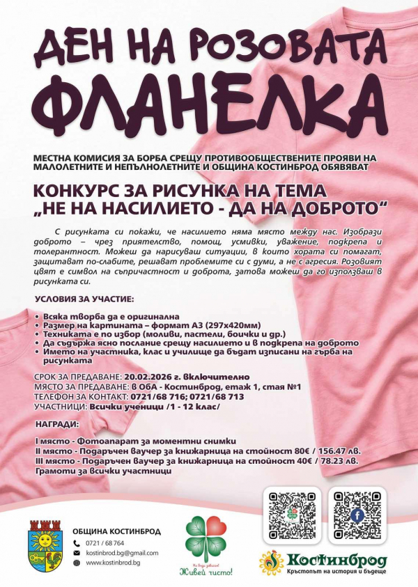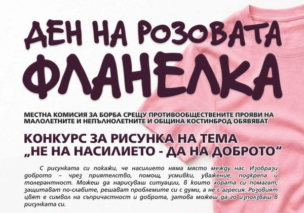 Местната комисия за борба срещу противообществените прояви на малолетните и непълнолетните (МКБППМН) и Община Костинброд обявяват конкурс за рисунка под надслов „Не на насилието – да на доброто“. Инициативата се организира по повод Деня на розовата фланелка – международна кампания срещу тормоза в училище, който се отбелязва всяка година в последната сряда на месец февруари.