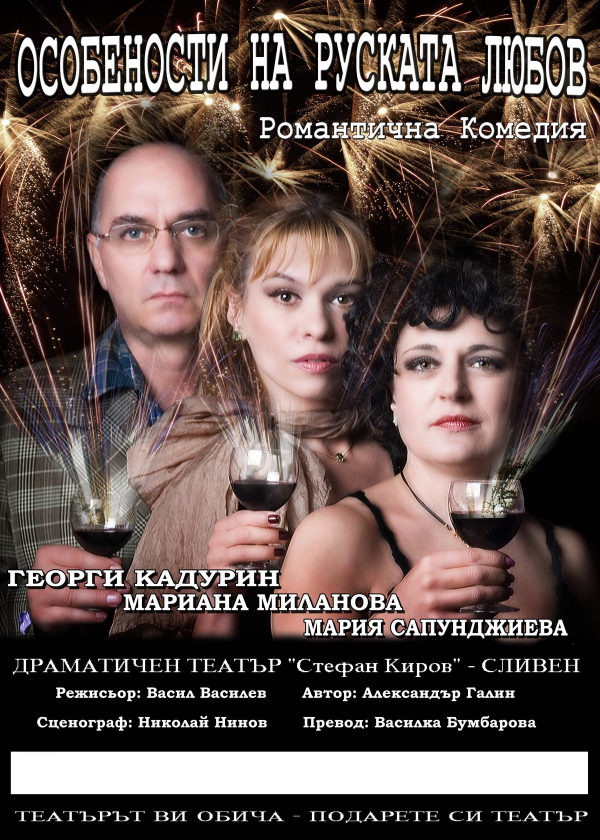 Романтичната комедия „Особености на руската любов“ с участието на Георги Кадурин, Мариана Миладинова и Мария Сапунджиева ще зрасмее костинбродчани на 2 февруари. Пиесата на Александър Галин ще бъде представена от 19:00 ч., в НЧ „Иван Вазов 1947”. Билети могат да бъдат закупени в библиотеката на читалището.