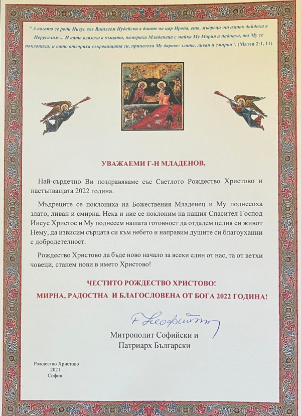 Митрополит Софийски и Патриарх Български изпрати поздравителен адрес до кмета на община Костинброд, г-н Трайко Младенов и всички жители на общината: