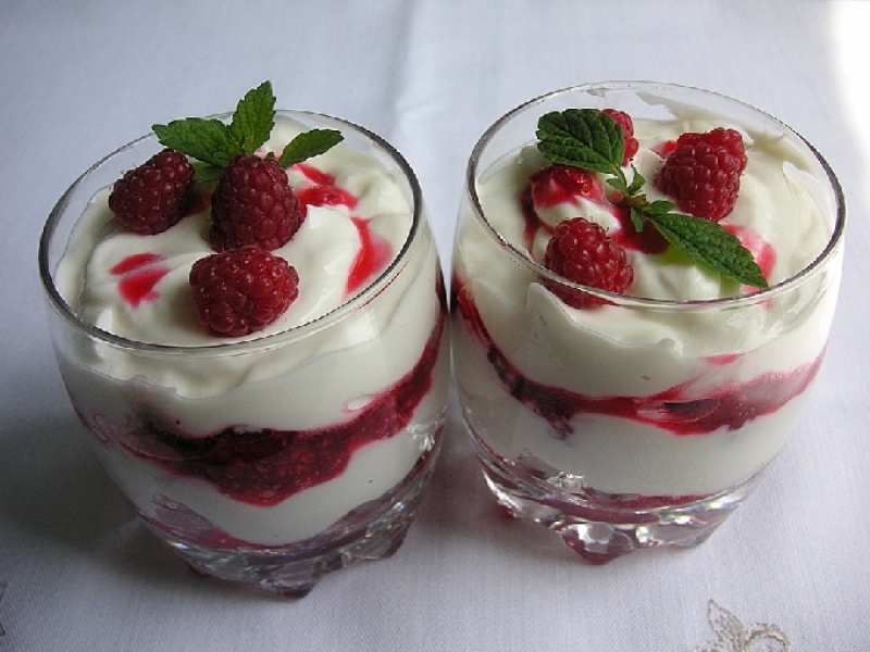 4. В стъклени купички или чаши сложете малко смес от сметана, прибавете пълнежа от малини и сложете по още един пласт от същите смеси, след което поставете в хладилника за 1-2 часа.