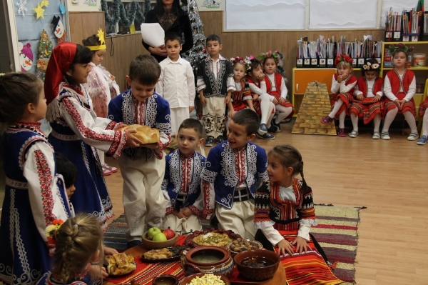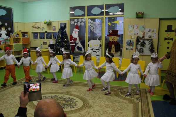 С много трепет и вълнение, подкрепяни от своите ръководители, най-малките дечица пресъздадоха представлението „Снежинки“, пяха песни и рецитираха стихотворения. С много танци и музика продължи и тържеството в останалите групи. Предучилищната група пресъздаде обичая „Бъдни Вечер“ с празнична трапеза, специално приготвена от родителите и децата. Типично в стила на Коледа, на тържеството дойдоха и малките коледари от първа задължителна предучилищна група, които пожелаха на всички здраве и късмет, спорна и благодатна нова година.
