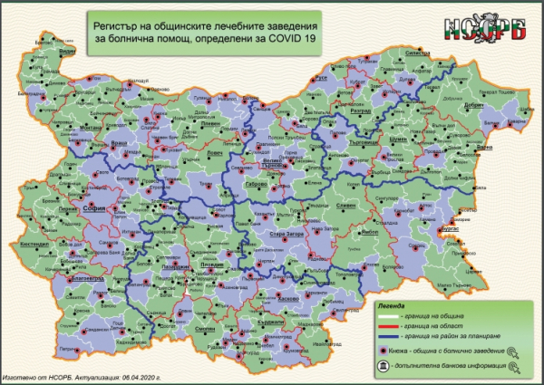 Интерактивна карта с актуалните данни за дарителските сметки, открити в помощ на общинските болници в борбата с COVID 19 изготви Националото сдружение на общините. В картата са посочени всички здравни заведения с цялата инормация за съществуващата база от легла и оборудване. В нея са отразени и дарителските сметки, както и нуждите от средства на местните здравни заведения. Картата е достъпна на сайта namrb.org, информацията в нея се актуализира системно, съобщиха от Сдружението.