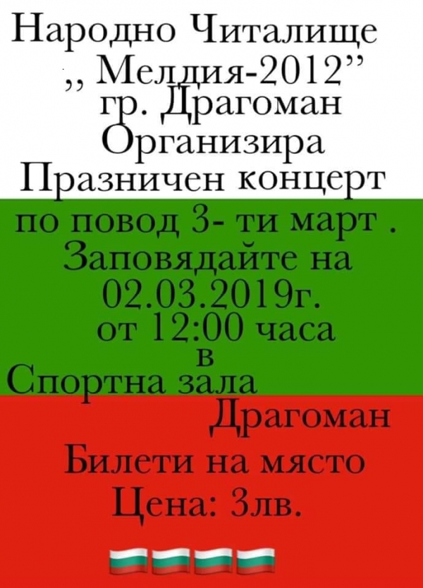 Спортната зала в Драгоман ще бъде домакин на празничен концерт по повод Трети март. Събитието, което ще се проведе един ден преди Националния празник на България се организира от Народно читалище „Мелдия-2012“ в града.