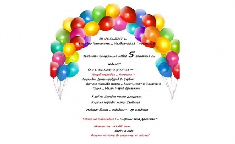 С тържествен концерт, днес от 18:00 ч. НЧ „Мелдия 2012“, гр. Драгоман ще отбележи петата годишнина от създаването си. Концертът ще се проведе в спортна зала „Драгоман“ и в него ще вземат участие танцов ансамбъл „Ритмика“, ансамбъл „Димитровград“ Р.Сърбия, детска танцова школа „Калотинче“ с. Калотина, група „Мелди“ гр. Драгоман, клуб по народни танци „Драгоман“, клуб по народни танци „Сливница“ и модерен балет „Невиданс“ гр. Сливница.
