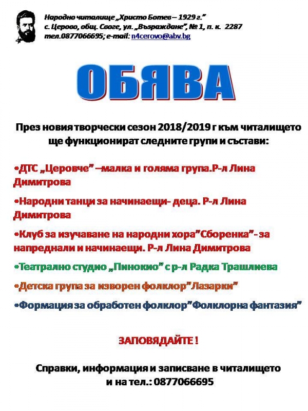 Народно читалище „Христо Ботев – 1929“ село Церово обявява прием за групите и съставите към читалището. През новия творчески сезон всички, които имат желание да се включат в дейността на читалището могат да го направят като се запишат в някоя от следните формации:
