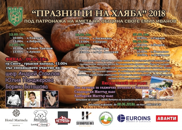 В продължение на месец, всяка събота и неделя „Празници на хляба“ ще се провеждат в различни населени места на територията на общината. Големият финал е предвиден за 9 юни 2018 от 11:00 часа на градския площад в Своге, като специални гости на закриването ще бъдат шеф Андрей Стоилов, Юлия Панджерова и Боряна Баташова.