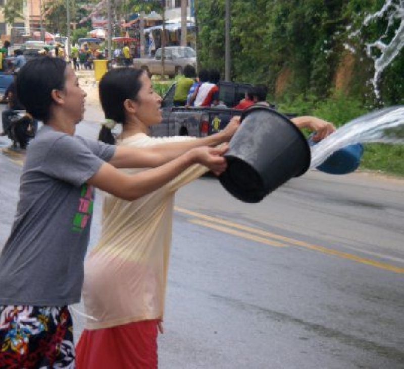 Хората в Тайланд хвърлят кофи с вода един върху друг и размазват талк по телата си.