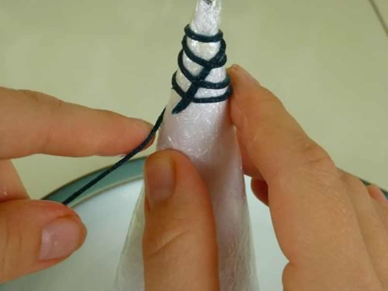 Започнете да увивате връвта около конусовидната форма. Първоначално направете няколко плътни обиколки около върха на конуса. Това ще фиксира края на конеца и елхичката от прежда няма да се разнищи.