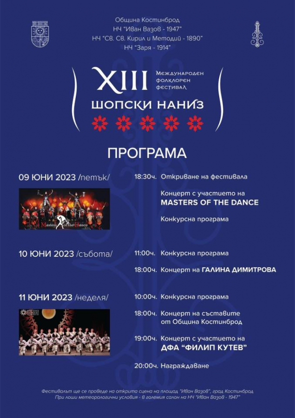 „Шопски наниз 2023“ ще се проведе на 9, 10 и 11 юни, на открита сцена на площад „Иван Вазов“. Организатори са Община Костинброд, НЧ „Иван Вазов1947”, НЧ „Св. Св. Кирил и Методий 1890”, и НЧ „Заря 1914“, със специалното съдействие на всички социални центрове на територията на общината.