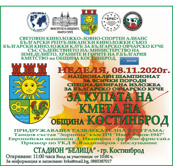Костинброд ще бъде домакин на национален шампионат за всички породи кучета за „Купата на кмета на община Костинброд“. Събитието ще се проведе на 18 ноември, от 11:00 ч. на стадион „Белица“, в гр. Костинброд. То ще бъде съпътствано от специализирана изложба на породата българско овчарско куче. Организатори са Световен киноложки-ловно-спортен алианс, Български републикански киноложки съюз и Български киноложки клуб за българско овчарско куче, със съдействието на Министерството на земеделието, храните и горите и Община Костинброд.