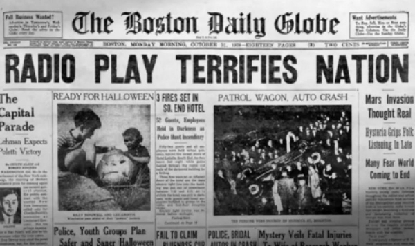 На 30 октомври 1938 г., в навечерието на Хелоуин, американският радиоводещ Орсън Уелс прекъсва своето радиопредаване с новината, че „Марсианците атакуват“. В ефир, той прави възстановка на романа на Хърбърт Уелс „Война на световете“, като в рамките на предаването си на няколко пъти посочва, че това е фалшива новина и четене на литературен текст.
