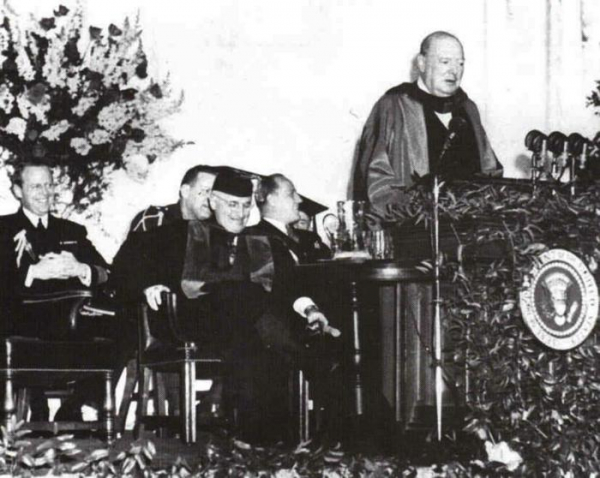 На 5 март 1946 г., британският политик и лидер на свободния свят по време на Втората световна война, Уинстън Чърчил, произнася знаменитата си реч Уестминстър колеж в град Фултън, щата Мисури, в която говори за международната обстановка и перспективите за опазване на света от тиранията и бедността. В нея, той казва знаменитата фраза, че над Източна Европа, контролирана от Съветския съюз е паднала „желязна завеса“ и демокрацията е унищожена за сметка на налагане на тоталитарни комунистически режими от страна на Москва.
