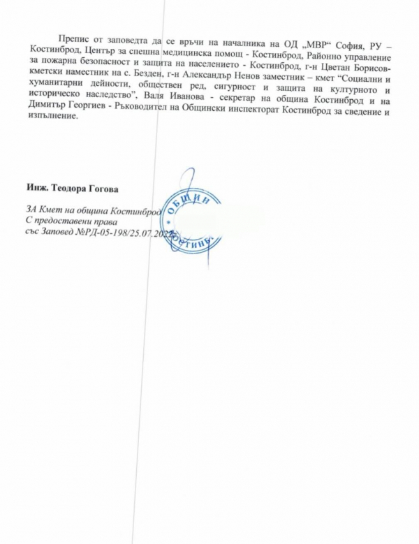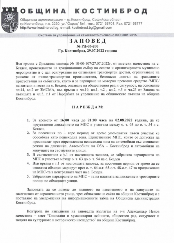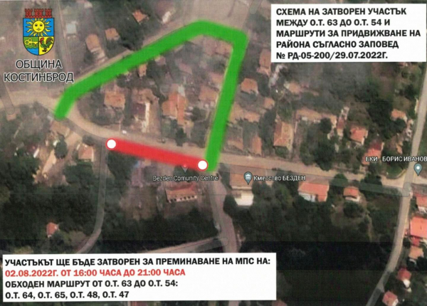 На 02 август, от 16:00 ч. до 21:00 ч. ще бъде преустановено движението на МПС в участъка между о. т. 63 до о. т. 54 в с. Безден. Това става ясно от заповед на ЗА кмета на община Костинброд  инж. Теодора Гогова.