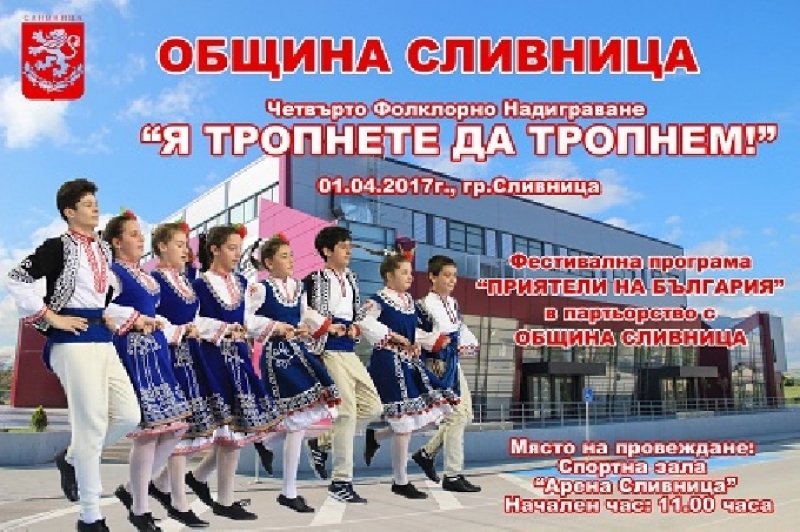 Четвърто Фолклорно Надиграване "Я ТРОПНЕТЕ, ДА ТРОПНЕМ!" ще се проведе на 01 април 2017 година в град Сливница. Събитието се организира от Фестивална програма "Приятели на България" в партньорство с Община Сливница и за пореден път е под патронажа на Областния управител на Софийска област.