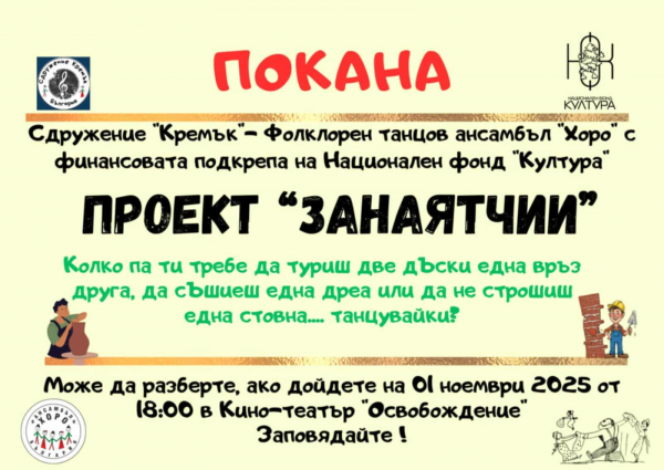 Смехът и традициите ще се срещнат на сцената на Кино–театър „Освобождение“ на 1 ноември 2025 г., когато от 18:00 ч. ще бъде представен проектът „Занаятчии“ на Сдружение „Кремък“ и фолклорен танцов ансамбъл „Хоро“. Събитието е част от честванията на Деня на народните будители и се осъществява с финансовата подкрепа на Национален фонд „Култура“.