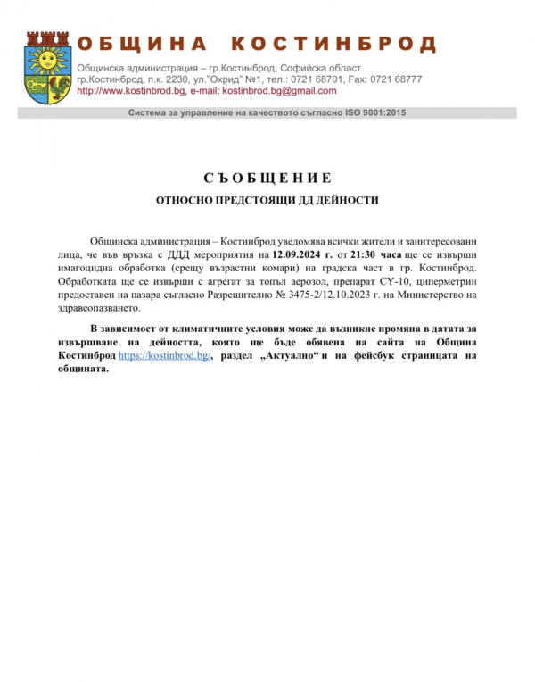 Общинска администрация - Костинброд уведомява всички жители и заинтересовани лица, че във връзка с ДДД мероприятия (дезинфекционни и дезинсекционни дейности), на 12.09.2024 г. (четвъртък), от 21:30 часа, ще се извърши имагоцидна обработка (срещу възрастни комари) на градската част в град Костинброд.