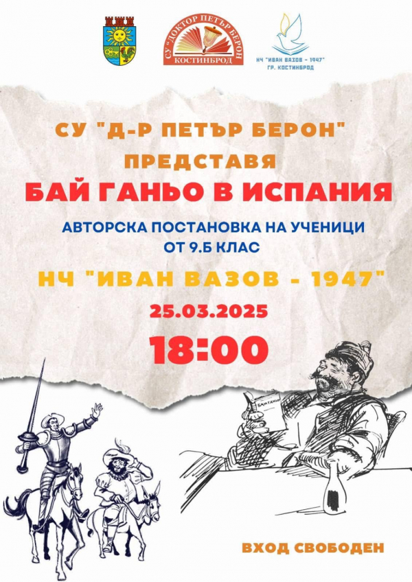 На 25 март 2025 г. от 18.00 часа в Народно читалище „Иван Вазов 1947“ в град Костинброд ще се състои премиерата на авторската постановка „Бай Ганьо в Испания“. Спектакълът е дело на учениците от 9.б клас на СУ „Д-р Петър Берон“ и обещава съвременен прочит на култовия образ на Алеко Константинов.