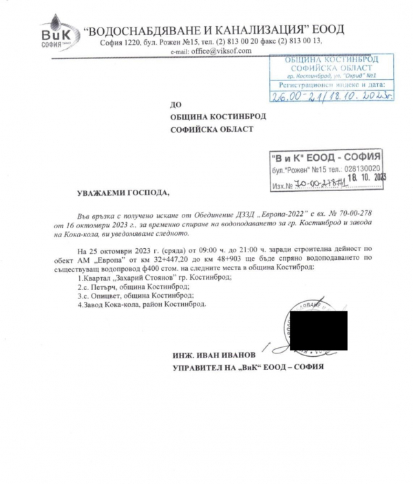 На 25 октомври 2023 г. (сряда) от 09.00 ч. до 21.00 ч. заради строителни дейности по обект АМ „Европа“, от км 32+447,20 до км 48+903, ще бъде спряно водоподаването на съществуващ водопровод ф400 стом. Това става ясно от писмо от ВиК Еоод-София до Община Костинброд.