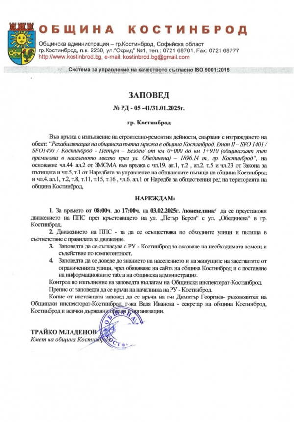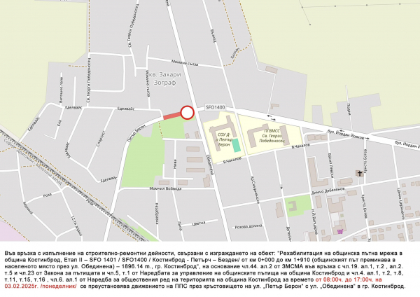За времето от 08:00 ч. до 17:00 ч. на 03.02.2025 г. /понеделник/ ще бъде преустановено движението на ППС през кръстовището на ул. „Петър Берон“ с ул. „Обединена“ в гр. Костинброд. За това информират от Общината.
