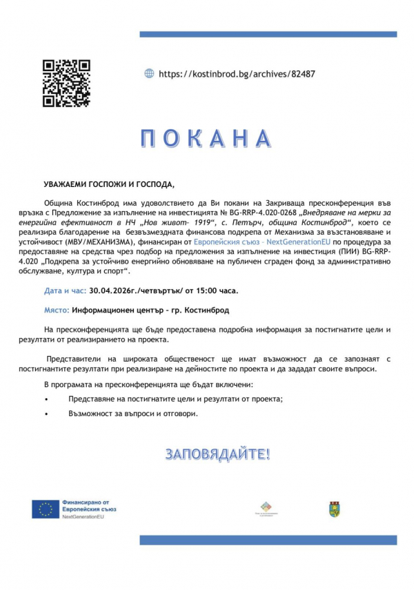 Закриваща пресконференция ще представи постигнатите резултати от реализиран проект за повишаване на енергийната ефективност на сградата на Народно читалище „Нов живот – 1919“ в село Петърч, община Костинброд. Събитието е част от дейностите по отчитане на изпълнението на инвестицията, осъществена с подкрепата на Механизма за възстановяване и устойчивост.
