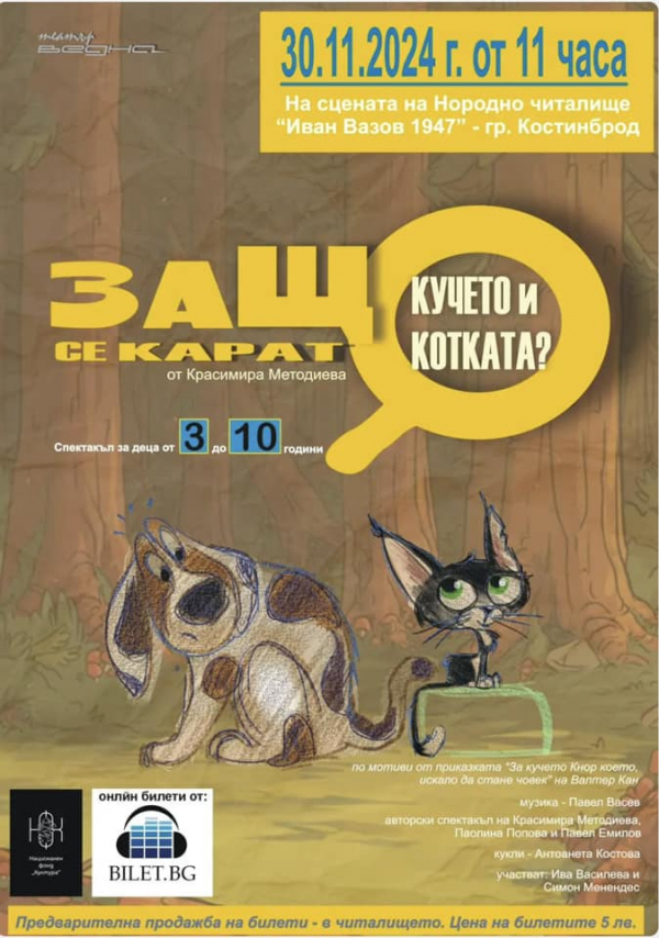 11:00 ч. „Защо се карат кучето и котката?“ – детски спектакъл, насочен към малчугани на възраст от 3 до 10 години. Историята ще забавлява децата, като едновременно с това ще им предаде ценни поуки. Цена на билета: 5 лв.