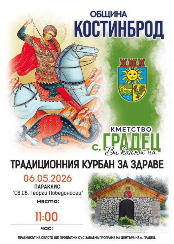 Гергьовден, посветен на свети Георги Победоносец, е символ на здраве, плодородие и ново начало и традиционно се отбелязва с курбан и общоселски събори в редица населени места в страната. В Градец празникът отново ще обедини хората около вярата, обичая и живата българска традиция.