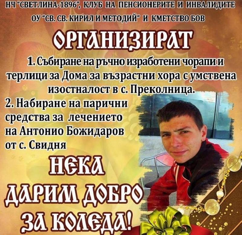 НЧ "Светлина-1896", Клуб на пенсонерите и инвалидите, ОУ "Св. Св. Крил и Методий" и кметство Бов организират дарителска инициатива "Нека дарим добро за Коледа".