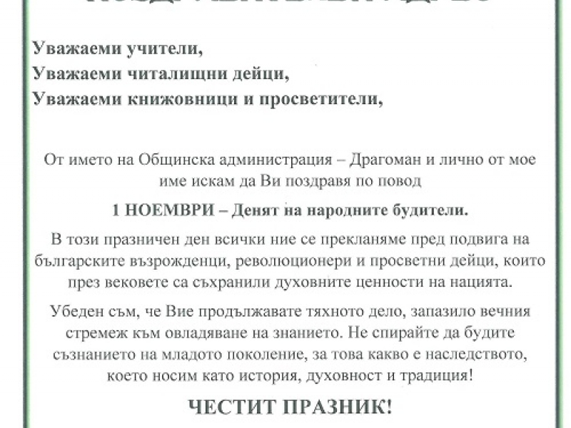 От името на Общинска администрация - Драгоман и лично от мое име искам да Ви поздравя по повод 1 ноември – Денят на народните будители. В този празничен ден всички ние се прекланяме пред подвига на българските възрожденци, революционери и просветни дейци, които през вековете са съхранили духовните ценности на нацията.