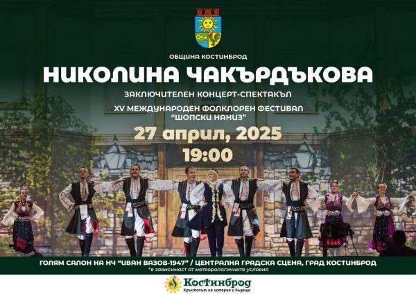 Обичаната народна певица Николина Чакърдъкова ще бъде специалният гост на заключителния концерт-спектакъл на XV Международен фолклорен фестивал „Шопски наниз“. Събитието ще се състои на 27 април 2025 г. от 19.00 часа в Големия салон на НЧ „Иван Вазов 1947“ или на Централната градска сцена в Костинброд (зависимост от метеорологичните условия).