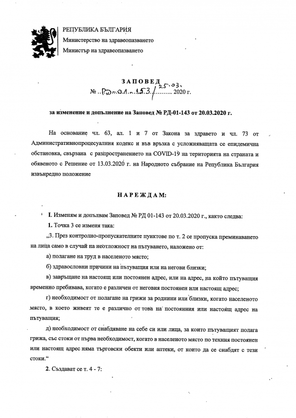 С текста на Заповед № РД-01-153/25.03.2020 г. за изменение и допълнение на Заповед № РД-01-143/20.03.2020 г., можете да се запознаете в прикачения файл.