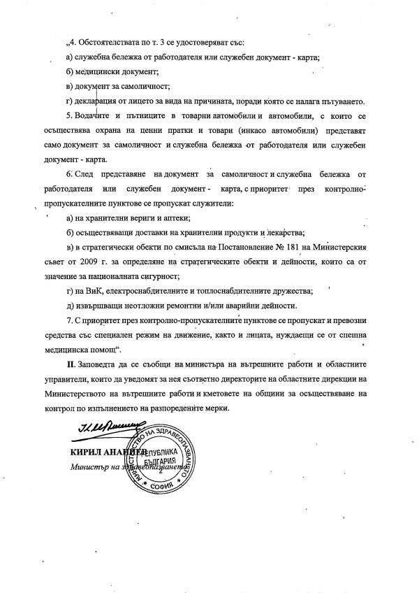 Министърът на здравеопазването издаде заповед, с която се облекчава преминаването през контролно-пропускателните пунктове на входно-изходните пътища на областните центрове. В заповедта се посочва: