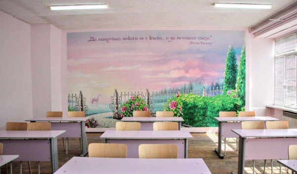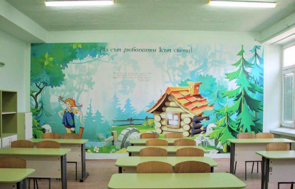 - Изготвяне на индивидуален интериорен дизайн за класните стаи, коридорите и фоайетата;
