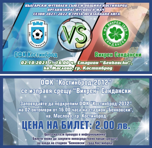 ОФК „Костинброд“ ще изиграе поредния си домакински мач от първенство 2021/2022 на Югозападна Трета лига. Тимът от Костинброд ще се изправи срещу ОФК „Вихрен“ (Сандански), на 2 октомври /събота/, на стадион „Бенковски“, кв. „Маслово“, от 16:00 ч.