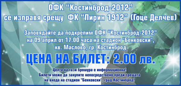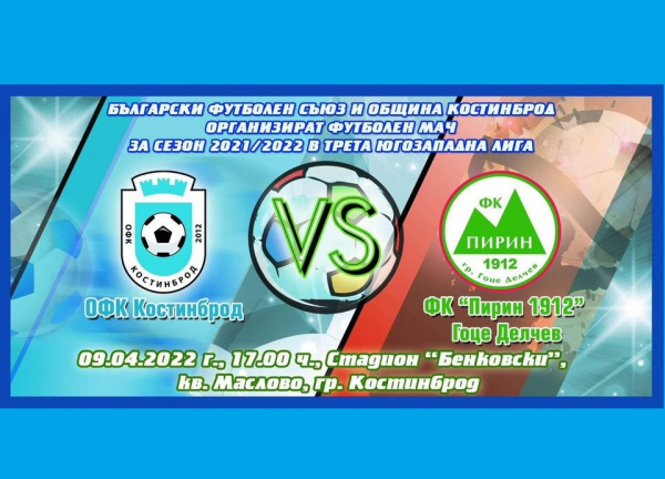 OФК „Костинброд“ ще изиграе домакински мач в 28-ми кръг от първенство 2021/2022 на Югозападна Трета лига. Тимът от Костинброд ще се изправи срещу ФК „Пирин - 1912“ (Гоце Делчев), на 9 април /събота/, на стадион „Бенковски“, кв. „Маслово“, от 17:00 ч.