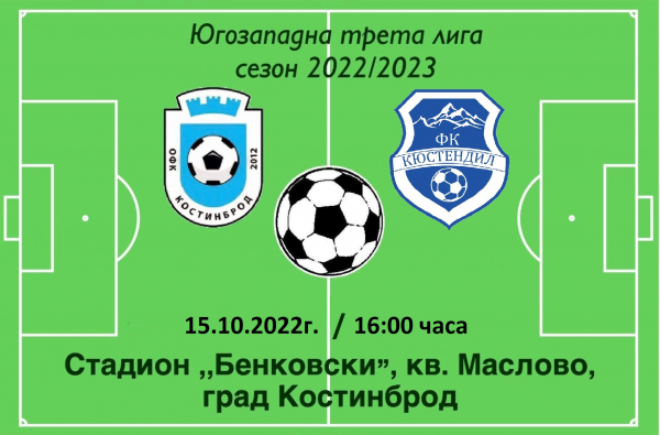 Пореден домакински мач ще изиграе ОФК „Костинброд 2012“ от първенство 2022/2023 на Югозападна Трета лига. На 15 октомври /събота/, тимът от Костинброд, който е и лидер в класирането, ще се изправи срещу ФК „Кюстендил“, на стадион „Бенковски“, кв. „Маслово“, от 16.00 ч.
