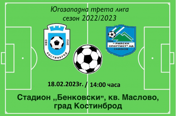Първи домакински мач ще изиграе ОФК „Костинброд 2012“ за 2023 година. На 18 февруари /събота/, тимът от Костинброд ще се изправи срещу ФК „Рилски спортист“ (Самоков), на стадион „Бенковски“, кв. „Маслово“. Мачът е от 14.00 ч. Първата среща между двата отбора завърши без победител.