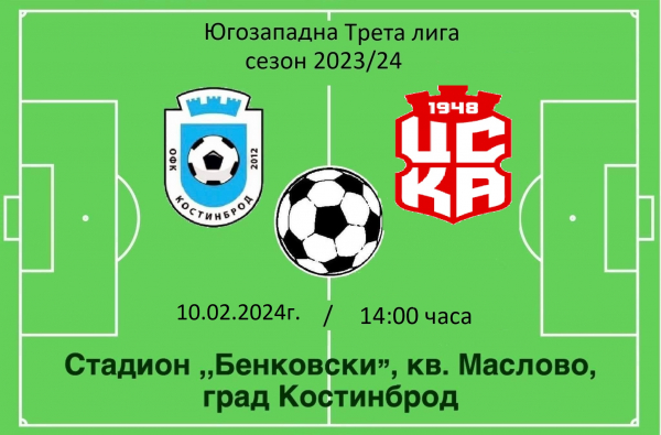 С отложен двубой, ОФК „Костинброд 2012“ ще стартира новата година. Възпитаниците на старши треньора Христо Коилов ще се изправят срещу тима на ЦСКА 1948 III. Срещата е на стадион „Бенковски“, кв. „Маслово“, на 10 февруари /събота/, от 14.00 ч.