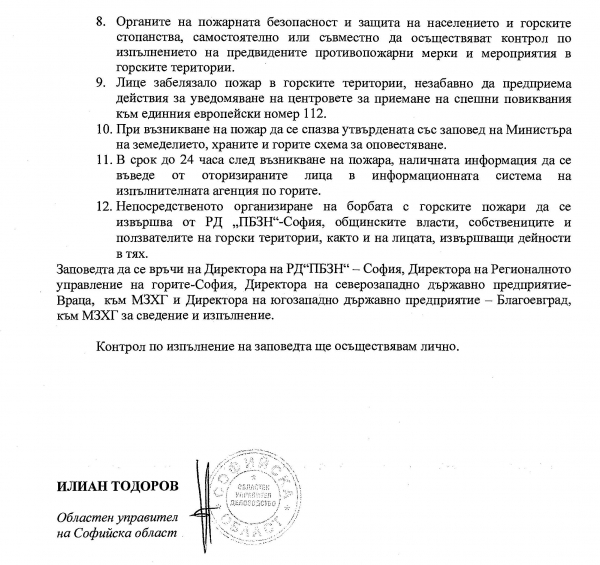 Областният управител на Софийска област Илиан Тодоров издаде заповед във връзка с настъпилия пожароопасен сезон от 01.04.2020 г. до 30.11.2020 г., за сведение на всички заинтересовани: