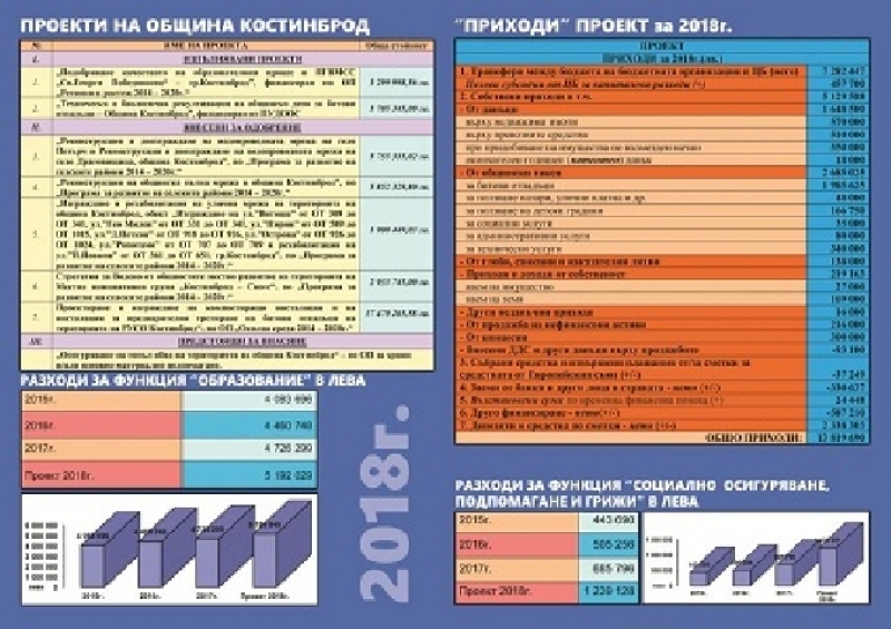 С новия обоснован и балансиран Бюджет 2018 г. е осигурено ритмичното финансиране на звената и заведенията и са обезпечени разходите в сферата на образованието, здравеопазването, социалните дейности, културата, спорта и инфраструктурните обекти. Чрез годишния финансов план община Костинброд ще реализира цели и приоритети, ще реши конкретни проблеми, като с това ще се стреми да подобрява условията на живот и публичните услуги на територията на общината, поясняват от местната администрация.
