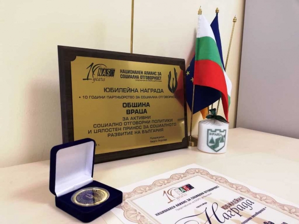 Община Враца получи юбилейна награда за активни социалноотговорни политики и цялостен принос за социалното развитие на България. Престижната награда бе връчена на заместник-кмета Петя Долапчиева на тържествена церемония, в рамките на двудневния международен форум „Партньорство за по-добри социални услуги, заетост и развитие“, организиран от Националния алианс за социална отговорност /НАСО/. Форумът, който се проведе във Варна, съвпадна и с отбелязването на 10-годишнината от създаването на Алианса.