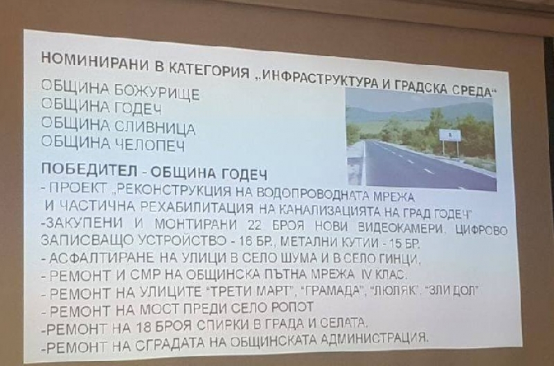 Награда в категория „Инфраструктура и градска среда” в конкурса „Най-успешно работеща община през 2016 г.“ получи община Годеч на церемония по връчване на Годишните награди на областния управител на Софийска област, г-жа Росица Иванова за 2016 г.