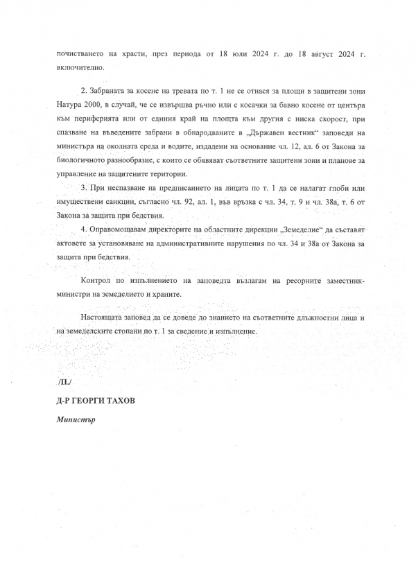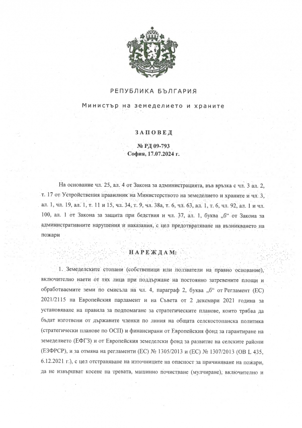 С цел предотвратяване възникването на пожари, ограничаване на тяхното развитие и разпространение и осигуряване на пожарна безопасност, периодът от 1 април до 30 октомври 2024 г. е определен за пожароопасен. Паленето на стърнища, слогове, крайпътни ивици, сухи треви и други растителни остатъци представлява нарушение на законодателството и всеки, който извършва тези дейности, ще бъде подведен под наказателна отговорност, както следва: