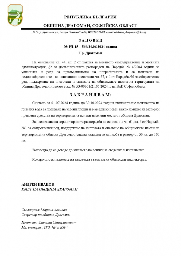 Община Драгоман въвежда забрана за ползването на питейна вода за поливане на зелени площи и земеделски земи, както и миене на моторни превозни средства на територията на всички населени места от общината. Забраната влиза в сила на 01.07.2024 г. и важи до 30.10.2024 г. (включително). На нарушителите ще бъдат налагани парични сакнции.