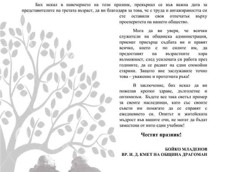 С поздравителен адрес, временно изпълняващият длъжността кмет на община Драгоман Бойко Младенов се обърна към съгражданите за Международния ден на възрастните хора. Приветствието е публикувано на официалния сайт на общината. Ето и пълният текст: