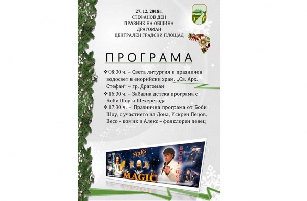 Празникът на община Драгоман - Стефановден ще започне в 8:30 ч. в храм „Св. Арх. Стефан“ с отслужване на Света литургия и празничен водосвет. Всички миряни са добре дошли в храма, за да запалят свещ за здравето на близките си и за благополучието на своя град.