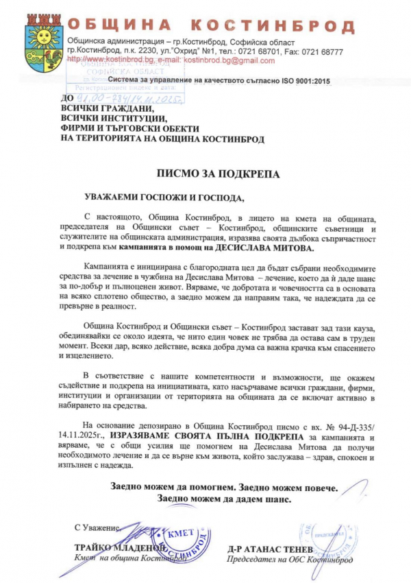 Община Костинброд официално застана зад дарителската кампания в подкрепа на Десислава Митова, за която е необходимо спешно лечение в чужбина. С писмо, подписано от кмета и председателя на Общинския съвет, местната администрация призовава граждани, институции и бизнеси да се включат в събирането на средства, подчертавайки, че единението и човешката съпричастност са ключът към спасяването на живот.