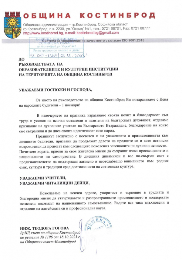 По повод Деня на народните будители, Община Костинброд отправи приветствие към всички учители, възпитатели, културни дейци и граждани на община Костинброд: