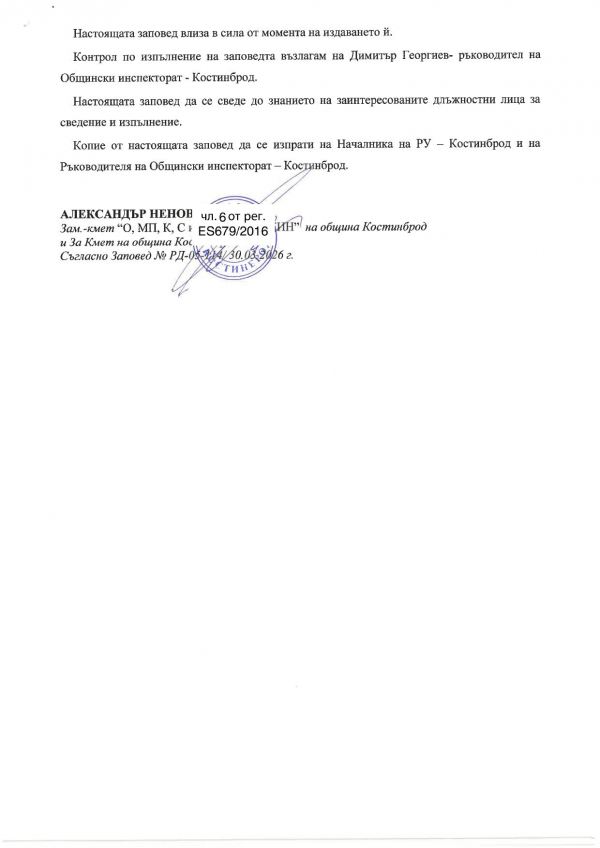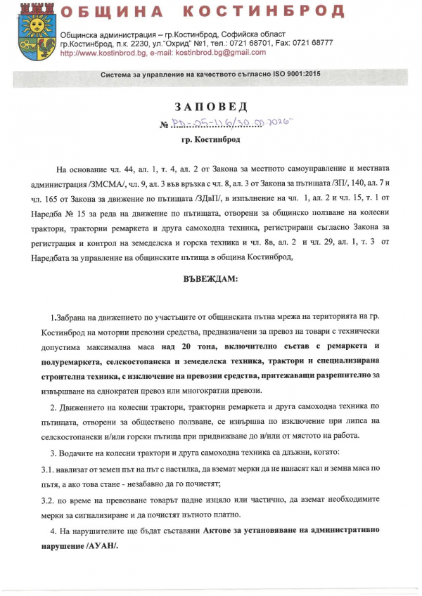 Със заповед на общинското ръководство в Костинброд се въвежда забрана на движението по участъците от общинската пътна мрежа на територията на гр. Костинброд на моторни превозни средства, предназначени за превоз на товари с технически допустима максимална маса над 20 тона, включително състав с ремаркета и полуремаркета, селскостопанска и земеделска техника, трактори и специализирана строителна техника, с изключение на превозни средства, притежаващи разрешително за извършване на еднократен превоз или многократни превози.