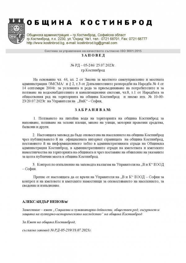 Община Костинброд уведомява своите жители, че въвежда забрана за ползването на питейна вода на територията на община Костинброд за напояване, поливане на зелени площи, миене на улици, моторни превозни средства, балкони и други.