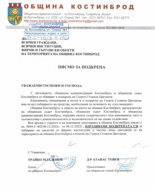 Община Костинброд изразява подкрепата си за набиране на средства на територията на общината, в помощ на Георги Стоянов Цветанов